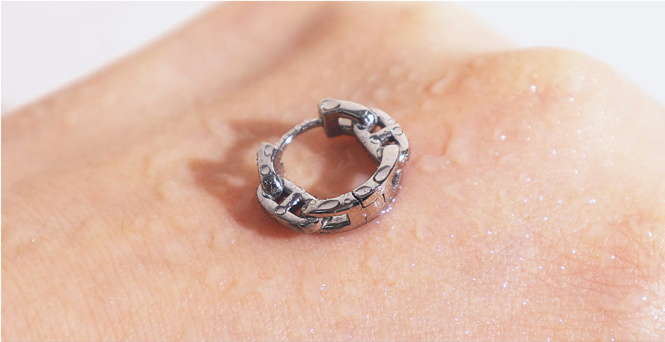 医療用のメスやハサミなどにも使われている肌に優しい素材。アレルギーがある・肌が弱い・敏感肌の方でも安心して着けられる。